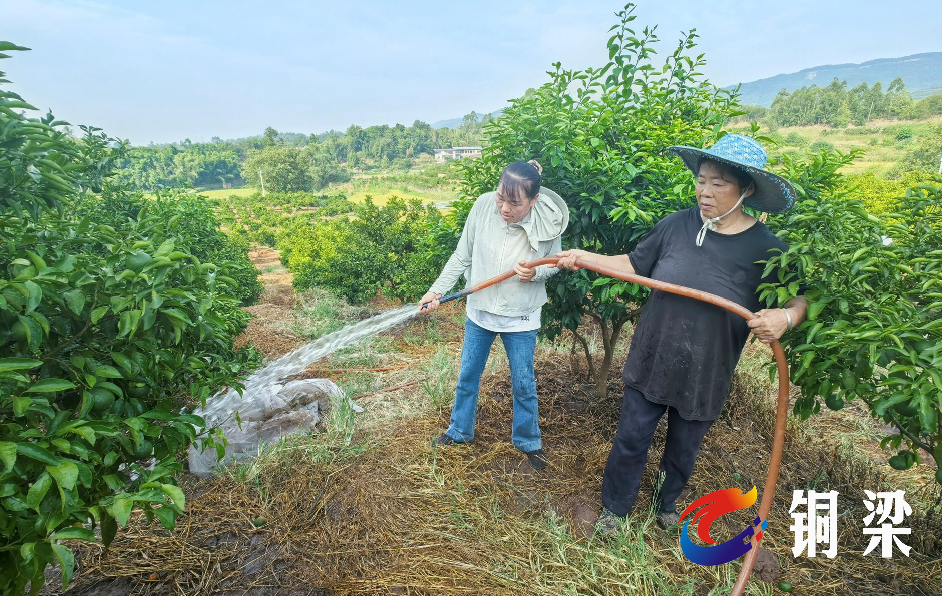 夏日的銅梁區(qū)福果鎮(zhèn)三星村,一人高的大雅柑樹整齊散布在幾個(gè)山頭,樹上已經(jīng)掛上了雞蛋大小的青果子。在基地務(wù)工的村民劉昌蘭正從果園蓄水池
